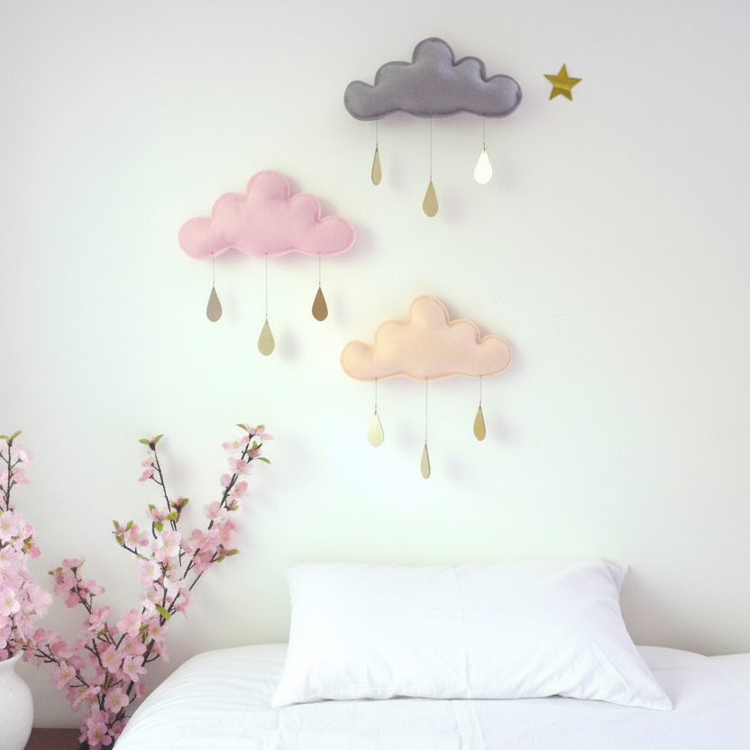 The golden raindrops add a delicate and elegant detail, perfect for a nursery or kids’ room.